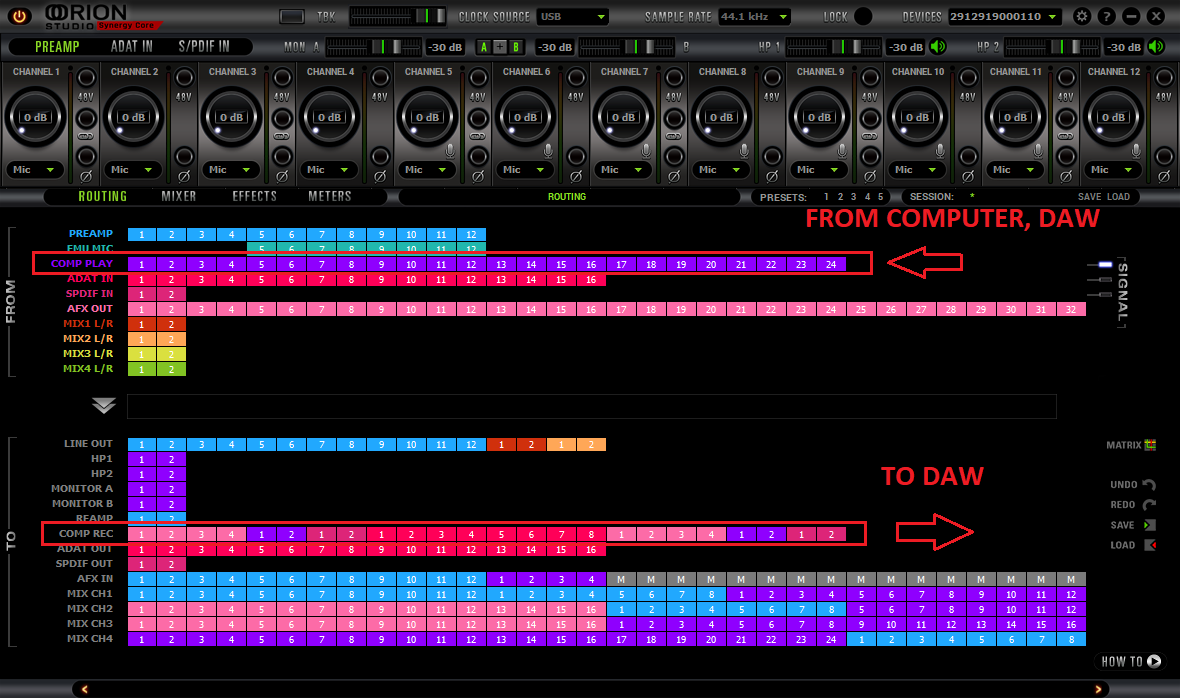 'COMP REC' represents the signal that goes into your computer. Depending on the channels you route (for example channels 1-4 in pink. See picture below) will correspond to input channels 1-4 inside your DAW.