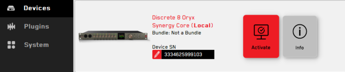 Launcher起動後、付属のUSBケーブルでDiscrete 8 Oryxをコンピュータに接続し、「Activate」ボタンをクリックして画面の指示に従ってください。