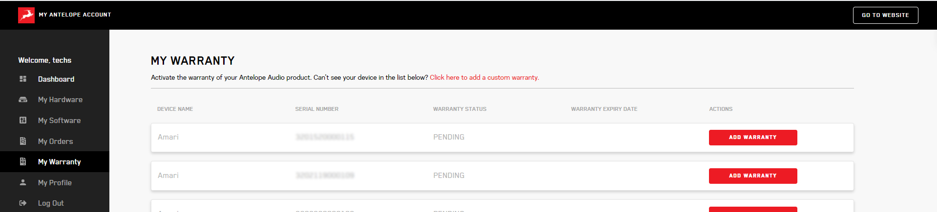 製品保証を有効にするには、「My Antelope Account」内の「My Warranty」タブへ移動します。